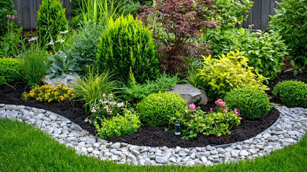 Lush garden landscaping design, backyard, flowers, shrubs, mulch